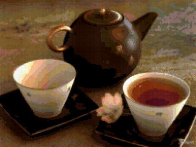Ориентировочно так, схема вышивки «Чай», созданная автором Banana, будет выглядеть при отшиве на канве. Размер данной вышивки равен 190x143 крестов, при этом используется 56 цветов. Ключевые слова, по которым можно найти эту схему: китай, чай, чашки. Также, вы можете взглянуть на оригинальную картинку, соответствующую данной схеме вышивки.