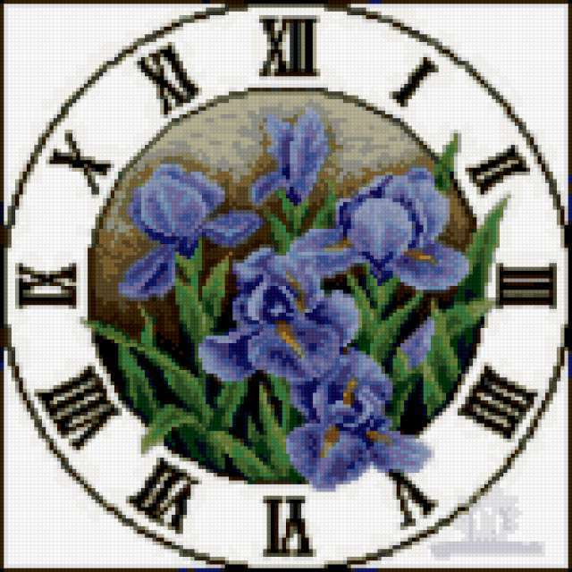 Ориентировочно так, схема вышивки «Часы», созданная автором kolst, будет выглядеть при отшиве на канве. Размер данной вышивки равен 150x150 крестов, при этом используется 50 цветов. Ключевые слова, по которым можно найти эту схему: цветы, букет, ирисы, часы. Также, вы можете взглянуть на оригинальную картинку, соответствующую данной схеме вышивки.