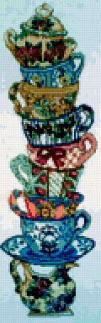 Ориентировочно так, схема вышивки «Чашки-чашечки», созданная автором belal14, будет выглядеть при отшиве на канве. Размер данной вышивки равен 60x190 крестов, при этом используется 58 цветов. Ключевые слова, по которым можно найти эту схему: посуда, чашки, кухня, натюрморт. Также, вы можете взглянуть на оригинальную картинку, соответствующую данной схеме вышивки.