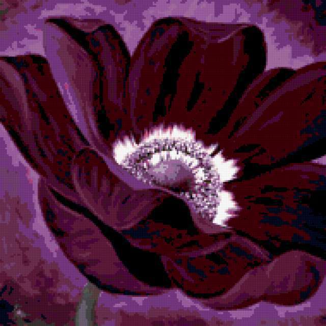 Ориентировочно так, схема вышивки «Чёрный мак», созданная автором Eddy, будет выглядеть при отшиве на канве. Размер данной вышивки равен 190x190 крестов, при этом используется 32 цветов. Ключевые слова, по которым можно найти эту схему: подушка, чёрные цветы, мак. Также, вы можете взглянуть на оригинальную картинку, соответствующую данной схеме вышивки.