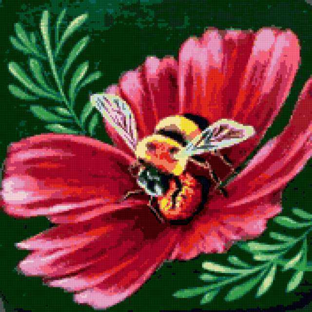 Ориентировочно так, схема вышивки «Шмель на цветке», созданная автором poltanya, будет выглядеть при отшиве на канве. Размер данной вышивки равен 176x176 крестов, при этом используется 40 цветов. Ключевые слова, по которым можно найти эту схему: букашки, шмель, цветок, космея, флора, природа, насекомые, картина, акварель. Также, вы можете взглянуть на оригинальную картинку, соответствующую данной схеме вышивки.