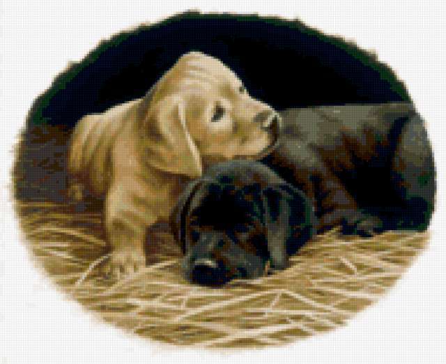 Ориентировочно так, схема вышивки «Щенки», созданная автором lv-sunflower, будет выглядеть при отшиве на канве. Размер данной вышивки равен 190x155 крестов, при этом используется 48 цветов. Ключевые слова, по которым можно найти эту схему: щенок, собака. Также, вы можете взглянуть на оригинальную картинку, соответствующую данной схеме вышивки.