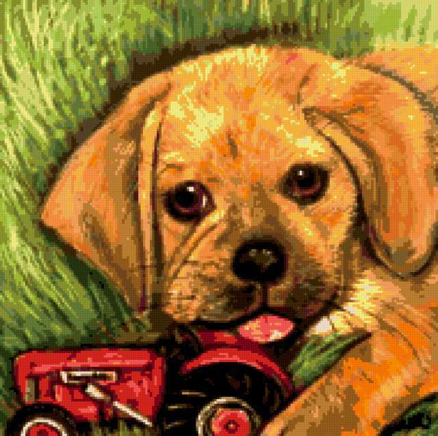 Ориентировочно так, схема вышивки «Щенок», созданная автором alena4, будет выглядеть при отшиве на канве. Размер данной вышивки равен 190x189 крестов, при этом используется 41 цветов. Ключевые слова, по которым можно найти эту схему: щенок, собака, игра, детское, животное, трактор, игрушка, машинка. Также, вы можете взглянуть на оригинальную картинку, соответствующую данной схеме вышивки.