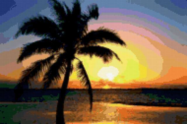 Ориентировочно так, схема вышивки «Южный расссвет», созданная автором LORIK_K, будет выглядеть при отшиве на канве. Размер данной вышивки равен 190x126 крестов, при этом используется 60 цветов. Ключевые слова, по которым можно найти эту схему: природа, рассвет, солнце, небо, утро, море, пальма. Также, вы можете взглянуть на оригинальную картинку, соответствующую данной схеме вышивки.