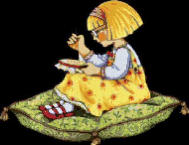 Ориентировочно так, схема вышивки «Юная вышивальщица», созданная автором Marina22, будет выглядеть при отшиве на канве. Размер данной вышивки равен 190x146 крестов, при этом используется 24 цветов. Ключевые слова, по которым можно найти эту схему: дети. Также, вы можете взглянуть на оригинальную картинку, соответствующую данной схеме вышивки.