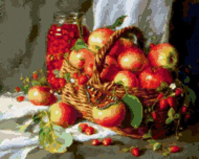 Ориентировочно так, схема вышивки «Яблоки и земляника», созданная автором poltanya, будет выглядеть при отшиве на канве. Размер данной вышивки равен 190x152 крестов, при этом используется 49 цветов. Ключевые слова, по которым можно найти эту схему: земляника, яблоки, украшения для кухни, корзина, натюрморт, красота, урожай, бабочка, корзина, клубника. Также, вы можете взглянуть на оригинальную картинку, соответствующую данной схеме вышивки.