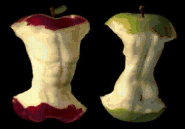 Ориентировочно так, схема вышивки «Яблоко», созданная автором y_tak, будет выглядеть при отшиве на канве. Размер данной вышивки равен 190x133 крестов, при этом используется 38 цветов. Ключевые слова, по которым можно найти эту схему: фрукты, мужчина, женщина, инь и янь. Также, вы можете взглянуть на оригинальную картинку, соответствующую данной схеме вышивки.