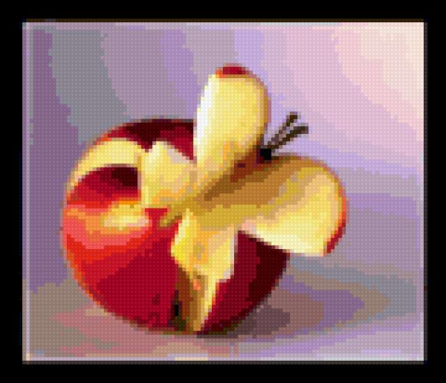 Ориентировочно так, схема вышивки «Яблоко», созданная автором lyolik, будет выглядеть при отшиве на канве. Размер данной вышивки равен 120x103 крестов, при этом используется 64 цветов. Ключевые слова, по которым можно найти эту схему: яблоко, бабочка. Также, вы можете взглянуть на оригинальную картинку, соответствующую данной схеме вышивки.