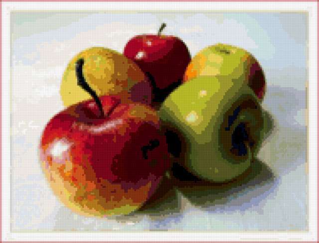 Ориентировочно так, схема вышивки «Яблочки», созданная автором malkinaiv, будет выглядеть при отшиве на канве. Размер данной вышивки равен 190x145 крестов, при этом используется 72 цветов. Ключевые слова, по которым можно найти эту схему: фрукты, яблоки. Также, вы можете взглянуть на оригинальную картинку, соответствующую данной схеме вышивки.