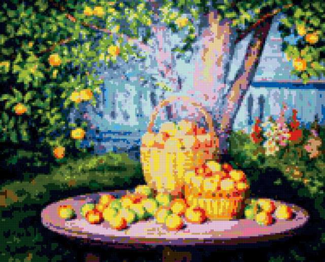 Ориентировочно так, схема вышивки «Яблочный Спас», созданная автором poltanya, будет выглядеть при отшиве на канве. Размер данной вышивки равен 190x153 крестов, при этом используется 42 цветов. Ключевые слова, по которым можно найти эту схему: яблочный спас, в саду, apples, apple, яблоки, урожай, яблочки, корзина, плоды, яблоневый сад. Также, вы можете взглянуть на оригинальную картинку, соответствующую данной схеме вышивки.
