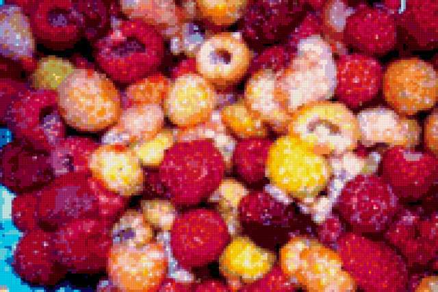 Ориентировочно так, схема вышивки «Ягода-малина!», созданная автором malkinaiv, будет выглядеть при отшиве на канве. Размер данной вышивки равен 190x127 крестов, при этом используется 71 цветов. Ключевые слова, по которым можно найти эту схему: ягоды, малина. Также, вы можете взглянуть на оригинальную картинку, соответствующую данной схеме вышивки.