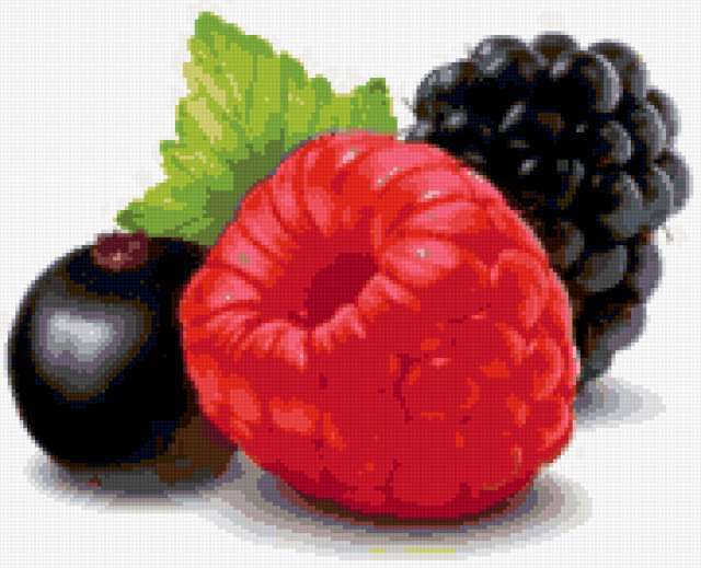 Ориентировочно так, схема вышивки «Ягодки», созданная автором Kitkat, будет выглядеть при отшиве на канве. Размер данной вышивки равен 180x146 крестов, при этом используется 38 цветов. Ключевые слова, по которым можно найти эту схему: ягоды, фрукты, малина. Также, вы можете взглянуть на оригинальную картинку, соответствующую данной схеме вышивки.