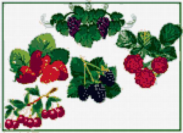 Ориентировочно так, схема вышивки «Ягоды», созданная автором a1ina79, будет выглядеть при отшиве на канве. Размер данной вышивки равен 150x109 крестов, при этом используется 20 цветов. Ключевые слова, по которым можно найти эту схему: ягоды, клубника. Также, вы можете взглянуть на оригинальную картинку, соответствующую данной схеме вышивки.