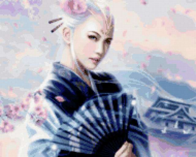 Ориентировочно так, схема вышивки «Японка», созданная автором a_ahuli, будет выглядеть при отшиве на канве. Размер данной вышивки равен 190x152 крестов, при этом используется 65 цветов. Ключевые слова, по которым можно найти эту схему: японка, веер, девушка, восток. Также, вы можете взглянуть на оригинальную картинку, соответствующую данной схеме вышивки.