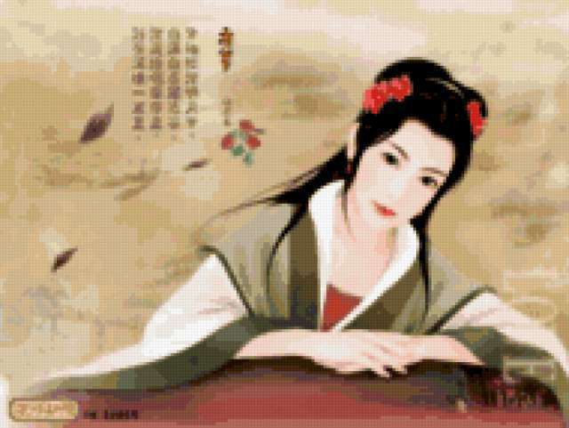 Ориентировочно так, схема вышивки «Японка», созданная автором OlgaSvi, будет выглядеть при отшиве на канве. Размер данной вышивки равен 190x143 крестов, при этом используется 60 цветов. Ключевые слова, по которым можно найти эту схему: японка, китай, япония. Также, вы можете взглянуть на оригинальную картинку, соответствующую данной схеме вышивки.