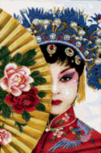 Ориентировочно так, схема вышивки «Японка», созданная автором xa00p3857, будет выглядеть при отшиве на канве. Размер данной вышивки равен 126x190 крестов, при этом используется 81 цветов. Ключевые слова, по которым можно найти эту схему: девушка, женщина, японка, человек, люди, портрет, веер, розы. Также, вы можете взглянуть на оригинальную картинку, соответствующую данной схеме вышивки.