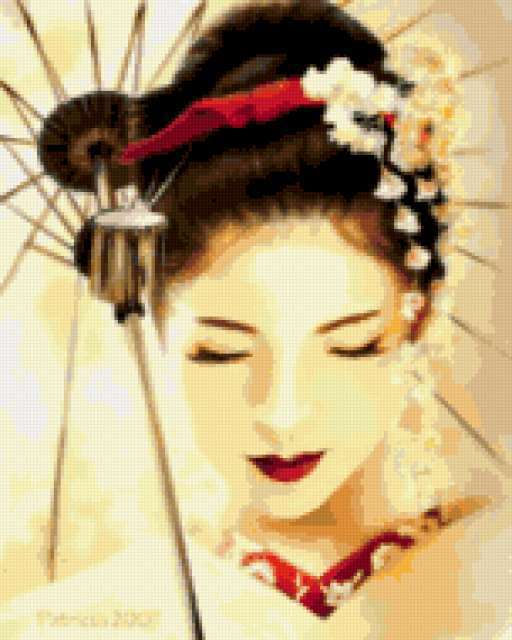 Ориентировочно так, схема вышивки «Японка.», созданная автором Fridka, будет выглядеть при отшиве на канве. Размер данной вышивки равен 152x190 крестов, при этом используется 60 цветов. Ключевые слова, по которым можно найти эту схему: япония. Также, вы можете взглянуть на оригинальную картинку, соответствующую данной схеме вышивки.