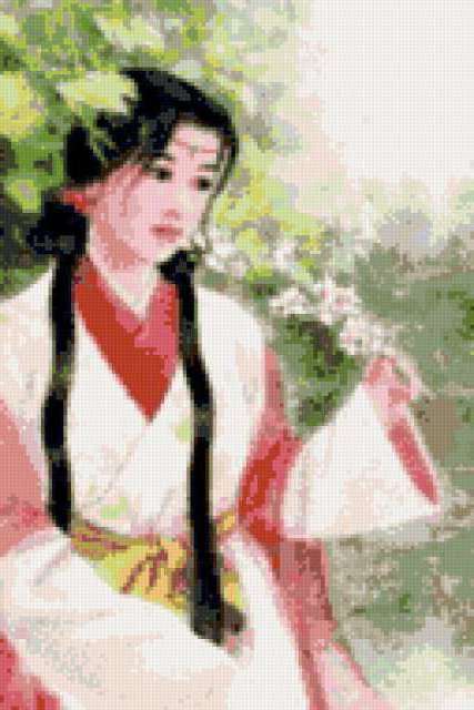 Ориентировочно так, схема вышивки «Японская красавица», созданная автором marrpu, будет выглядеть при отшиве на канве. Размер данной вышивки равен 127x190 крестов, при этом используется 45 цветов. Ключевые слова, по которым можно найти эту схему: япония, девуша, японка, красавица. Также, вы можете взглянуть на оригинальную картинку, соответствующую данной схеме вышивки.