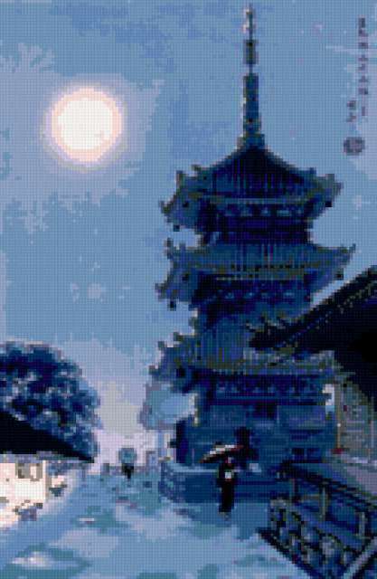 Ориентировочно так, схема вышивки «Японская улочка», созданная автором rybka6, будет выглядеть при отшиве на канве. Размер данной вышивки равен 124x190 крестов, при этом используется 31 цветов. Ключевые слова, по которым можно найти эту схему: япония, архитектура, искусство, живопись, картина, пейзаж, пагода, ночь, луна. Также, вы можете взглянуть на оригинальную картинку, соответствующую данной схеме вышивки.