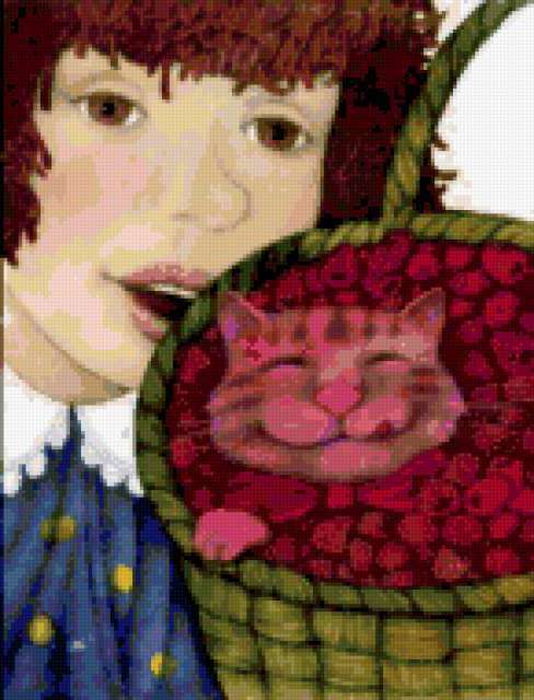 Ориентировочно так, схема вышивки «кот в малине», созданная автором dect81, будет выглядеть при отшиве на канве. Размер данной вышивки равен 145x190 крестов, при этом используется 75 цветов. Ключевые слова, по которым можно найти эту схему: кот, кошки, животные. Также, вы можете взглянуть на оригинальную картинку, соответствующую данной схеме вышивки.