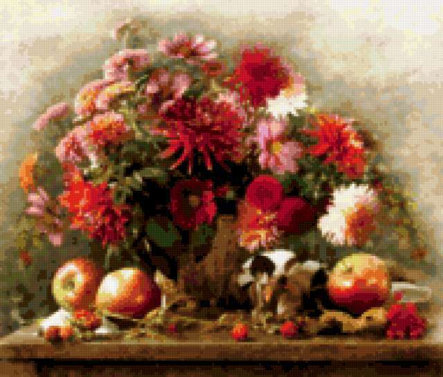 Ориентировочно так, схема вышивки «натюрморт», созданная автором dect81, будет выглядеть при отшиве на канве. Размер данной вышивки равен 190x162 крестов, при этом используется 76 цветов. Ключевые слова, по которым можно найти эту схему: цветы, живопись, натюрморт, букет. Также, вы можете взглянуть на оригинальную картинку, соответствующую данной схеме вышивки.