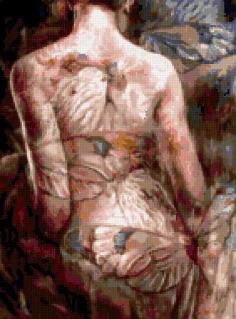 Ориентировочно так, схема вышивки «-», созданная автором klop, будет выглядеть при отшиве на канве. Размер данной вышивки равен 141x190 крестов, при этом используется 43 цветов. Ключевые слова, по которым можно найти эту схему: женщина, бабочки, тату. Также, вы можете взглянуть на оригинальную картинку, соответствующую данной схеме вышивки.
