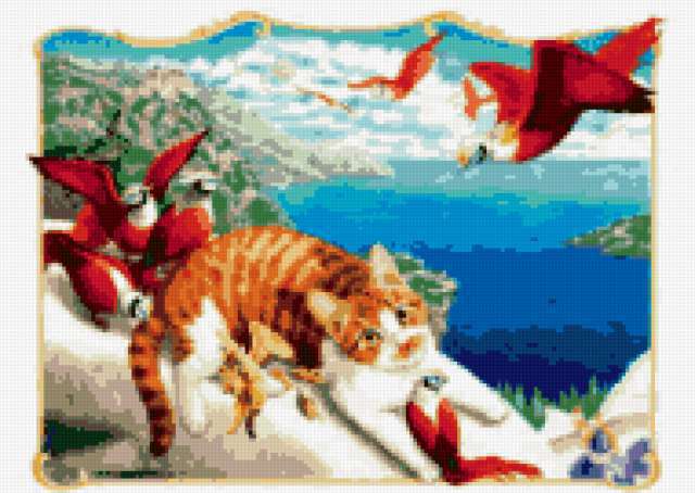 Ориентировочно так, схема вышивки «...», созданная автором gemini6, будет выглядеть при отшиве на канве. Размер данной вышивки равен 190x135 крестов, при этом используется 49 цветов. Ключевые слова, по которым можно найти эту схему: кошки цветы. Также, вы можете взглянуть на оригинальную картинку, соответствующую данной схеме вышивки.