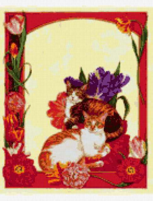 Ориентировочно так, схема вышивки «...», созданная автором gemini6, будет выглядеть при отшиве на канве. Размер данной вышивки равен 140x184 крестов, при этом используется 42 цветов. Ключевые слова, по которым можно найти эту схему: кошки цветы. Также, вы можете взглянуть на оригинальную картинку, соответствующую данной схеме вышивки.