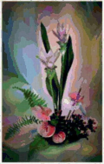 Ориентировочно так, схема вышивки «...», созданная автором gemini6, будет выглядеть при отшиве на канве. Размер данной вышивки равен 120x189 крестов, при этом используется 71 цветов. Ключевые слова, по которым можно найти эту схему: цветы букет. Также, вы можете взглянуть на оригинальную картинку, соответствующую данной схеме вышивки.