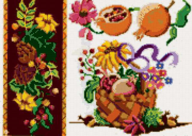 Ориентировочно так, схема вышивки «...», созданная автором gemini6, будет выглядеть при отшиве на канве. Размер данной вышивки равен 180x128 крестов, при этом используется 40 цветов. Ключевые слова, по которым можно найти эту схему: кухня фрукты. Также, вы можете взглянуть на оригинальную картинку, соответствующую данной схеме вышивки.