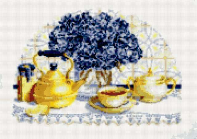 Ориентировочно так, схема вышивки «...», созданная автором gemini6, будет выглядеть при отшиве на канве. Размер данной вышивки равен 180x127 крестов, при этом используется 35 цветов. Ключевые слова, по которым можно найти эту схему: посуда цветы кухня. Также, вы можете взглянуть на оригинальную картинку, соответствующую данной схеме вышивки.