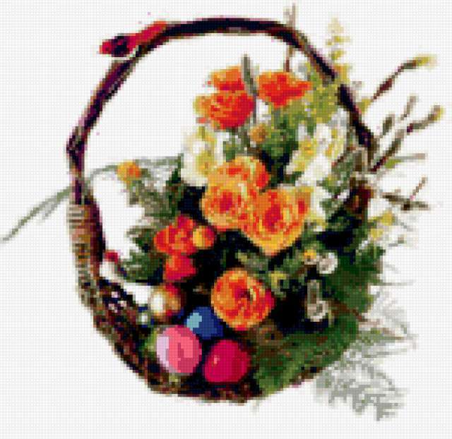 Ориентировочно так, схема вышивки «...», созданная автором gemini6, будет выглядеть при отшиве на канве. Размер данной вышивки равен 150x146 крестов, при этом используется 61 цветов. Ключевые слова, по которым можно найти эту схему: цветы пасха. Также, вы можете взглянуть на оригинальную картинку, соответствующую данной схеме вышивки.