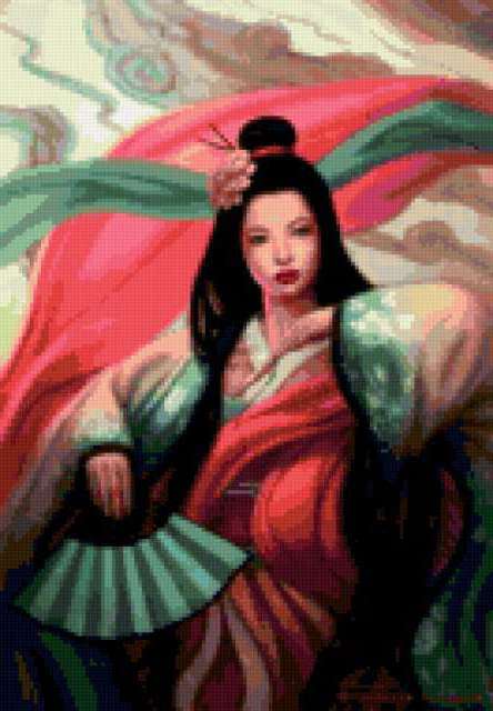 Ориентировочно так, схема вышивки «000», созданная автором Shuriken, будет выглядеть при отшиве на канве. Размер данной вышивки равен 132x190 крестов, при этом используется 70 цветов. К несчастью, автор не назначил для схемы ключевые слова. Также, вы можете взглянуть на оригинальную картинку, соответствующую данной схеме вышивки.