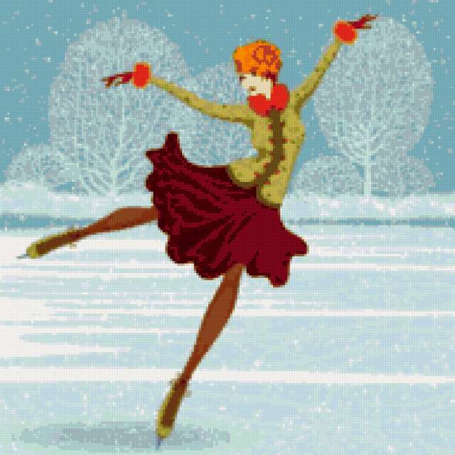 Ориентировочно так, схема вышивки «1», созданная автором ze79, будет выглядеть при отшиве на канве. Размер данной вышивки равен 190x190 крестов, при этом используется 39 цветов. Ключевые слова, по которым можно найти эту схему: зима, девушка, женщина, люди, на катке, подушка. Также, вы можете взглянуть на оригинальную картинку, соответствующую данной схеме вышивки.