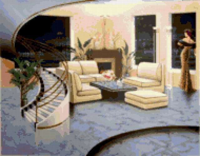 Ориентировочно так, схема вышивки «1», созданная автором ze79, будет выглядеть при отшиве на канве. Размер данной вышивки равен 190x148 крестов, при этом используется 60 цветов. Ключевые слова, по которым можно найти эту схему: интерьер, лесница, девушка, женщина, люди, дом. Также, вы можете взглянуть на оригинальную картинку, соответствующую данной схеме вышивки.