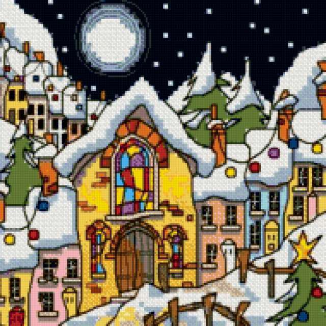 Ориентировочно так, схема вышивки «10», созданная автором dobroslava, будет выглядеть при отшиве на канве. Размер данной вышивки равен 190x190 крестов, при этом используется 78 цветов. Ключевые слова, по которым можно найти эту схему: зима, ночь, домик. Также, вы можете взглянуть на оригинальную картинку, соответствующую данной схеме вышивки.