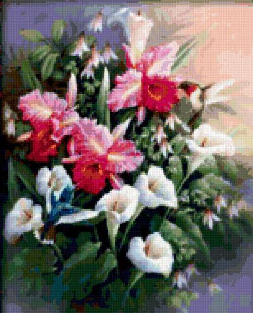 Ориентировочно так, схема вышивки «1011», созданная автором Valkiriya, будет выглядеть при отшиве на канве. Размер данной вышивки равен 154x190 крестов, при этом используется 85 цветов. Ключевые слова, по которым можно найти эту схему: цветы, колибри, птица, картина. Также, вы можете взглянуть на оригинальную картинку, соответствующую данной схеме вышивки.