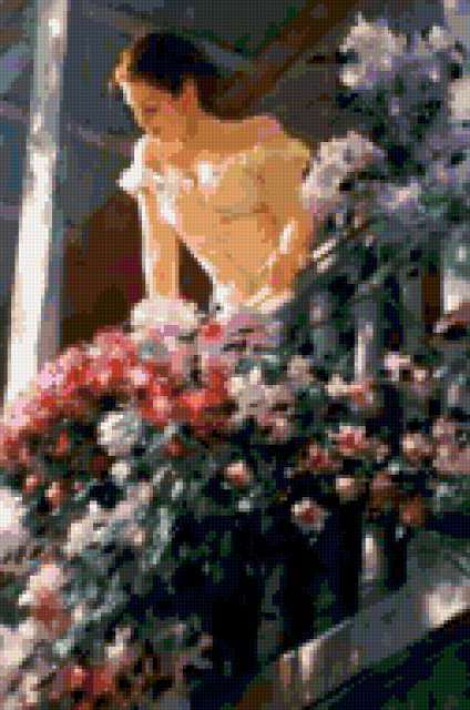 Ориентировочно так, схема вышивки «13», созданная автором tina1983, будет выглядеть при отшиве на канве. Размер данной вышивки равен 126x190 крестов, при этом используется 67 цветов. Ключевые слова, по которым можно найти эту схему: девушка, цветы, картина, жывопись. Также, вы можете взглянуть на оригинальную картинку, соответствующую данной схеме вышивки.