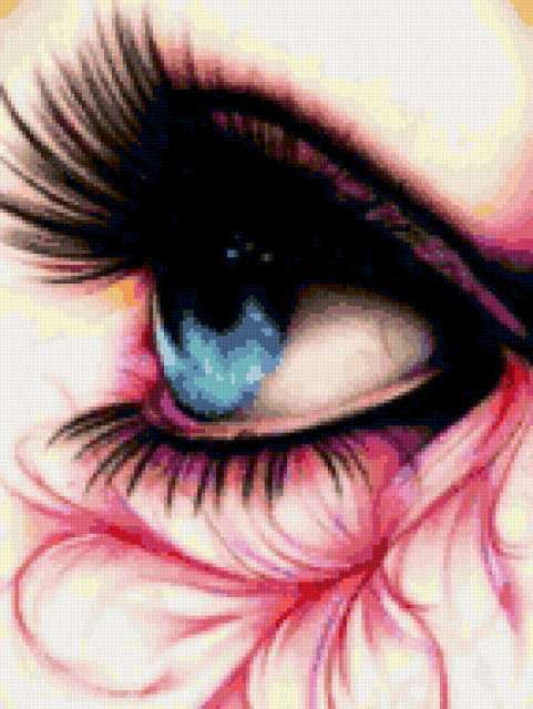 Ориентировочно так, схема вышивки «135», созданная автором Valkiriya, будет выглядеть при отшиве на канве. Размер данной вышивки равен 143x190 крестов, при этом используется 69 цветов. Ключевые слова, по которым можно найти эту схему: глаз. Также, вы можете взглянуть на оригинальную картинку, соответствующую данной схеме вышивки.