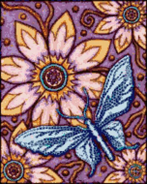 Ориентировочно так, схема вышивки «164545», созданная автором irenidanna, будет выглядеть при отшиве на канве. Размер данной вышивки равен 152x190 крестов, при этом используется 29 цветов. Ключевые слова, по которым можно найти эту схему: подушка, цветок, фентези, бабочка. Также, вы можете взглянуть на оригинальную картинку, соответствующую данной схеме вышивки.