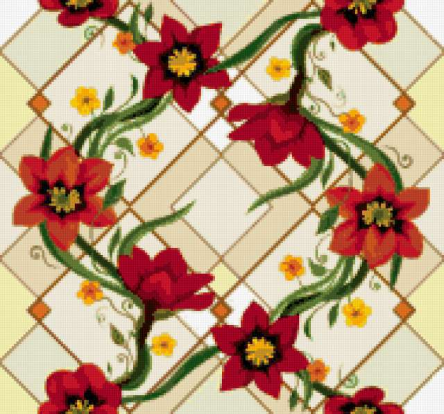 Ориентировочно так, схема вышивки «18148», созданная автором irenidanna, будет выглядеть при отшиве на канве. Размер данной вышивки равен 190x177 крестов, при этом используется 38 цветов. Ключевые слова, по которым можно найти эту схему: подушка, цветы, узор. Также, вы можете взглянуть на оригинальную картинку, соответствующую данной схеме вышивки.