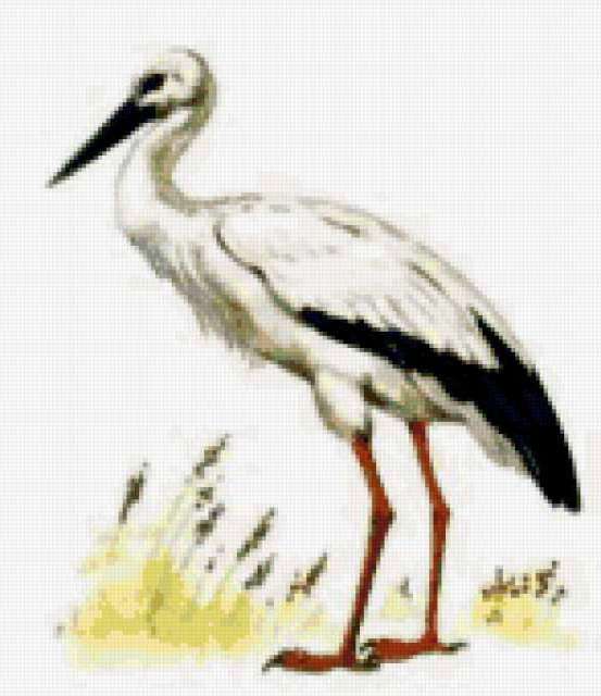 Ориентировочно так, схема вышивки «195», созданная автором Valkiriya, будет выглядеть при отшиве на канве. Размер данной вышивки равен 147x170 крестов, при этом используется 60 цветов. Ключевые слова, по которым можно найти эту схему: аист, птица. Также, вы можете взглянуть на оригинальную картинку, соответствующую данной схеме вышивки.