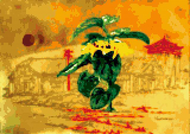 Ориентировочно так, схема вышивки «2», созданная автором meletopol, будет выглядеть при отшиве на канве. Размер данной вышивки равен 160x113 крестов, при этом используется 57 цветов. Ключевые слова, по которым можно найти эту схему: подсолнух. Также, вы можете взглянуть на оригинальную картинку, соответствующую данной схеме вышивки.