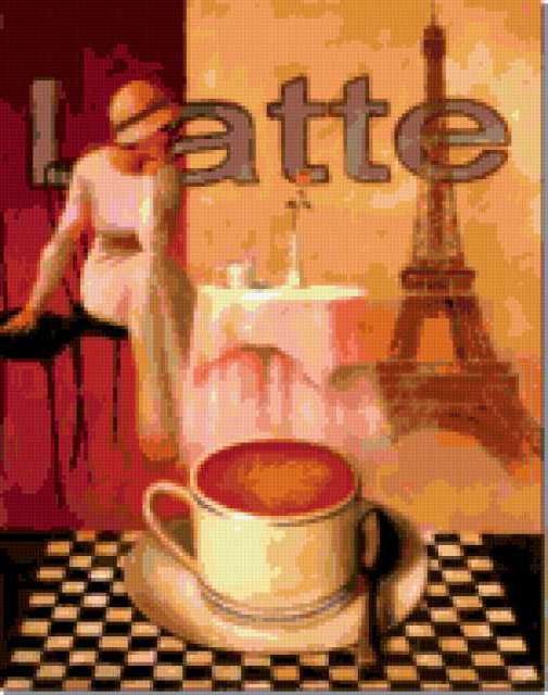 Ориентировочно так, схема вышивки «2», созданная автором ze79, будет выглядеть при отшиве на канве. Размер данной вышивки равен 150x190 крестов, при этом используется 44 цветов. Ключевые слова, по которым можно найти эту схему: кофе, для кухни, девушка, женщина, люди, город. Также, вы можете взглянуть на оригинальную картинку, соответствующую данной схеме вышивки.