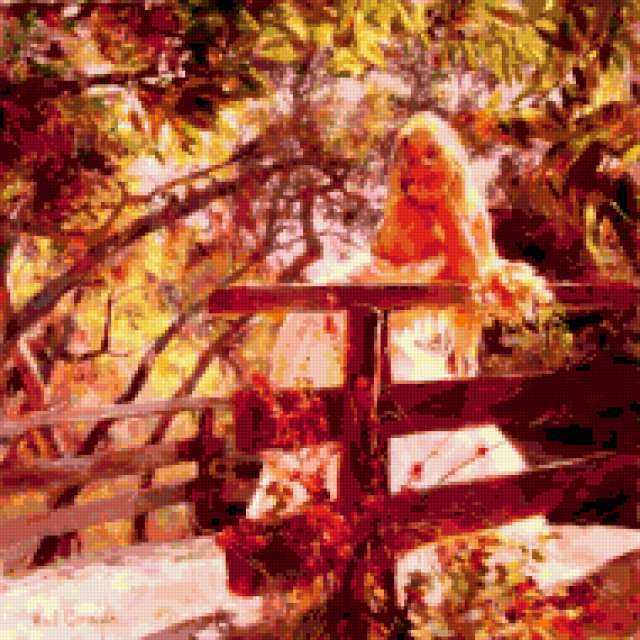 Ориентировочно так, схема вышивки «21», созданная автором tina1983, будет выглядеть при отшиве на канве. Размер данной вышивки равен 190x190 крестов, при этом используется 72 цветов. Ключевые слова, по которым можно найти эту схему: девушка, картина, живопись. Также, вы можете взглянуть на оригинальную картинку, соответствующую данной схеме вышивки.