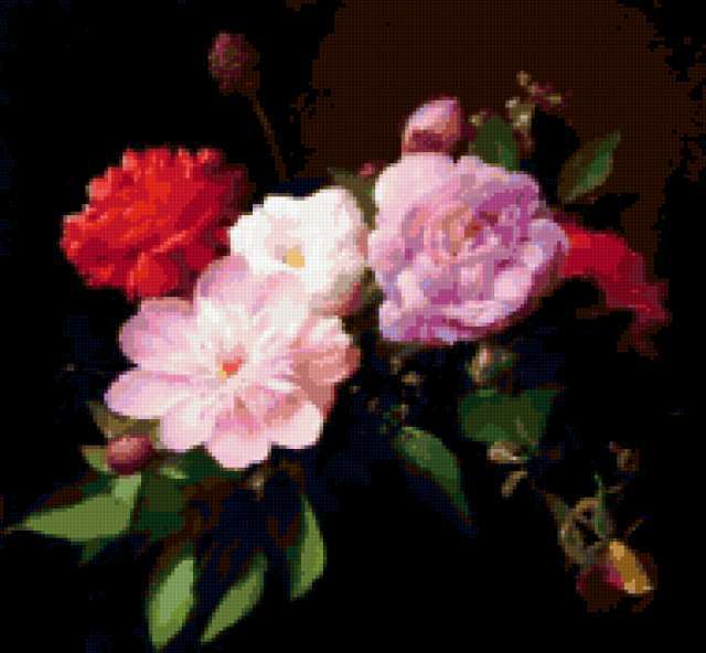 Ориентировочно так, схема вышивки «2105», созданная автором polovinkamarinka, будет выглядеть при отшиве на канве. Размер данной вышивки равен 190x176 крестов, при этом используется 62 цветов. Ключевые слова, по которым можно найти эту схему: живопись, картина, цветы. Также, вы можете взглянуть на оригинальную картинку, соответствующую данной схеме вышивки.