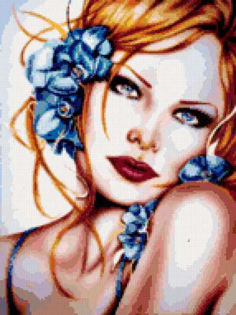 Ориентировочно так, схема вышивки «22», созданная автором Troyanda, будет выглядеть при отшиве на канве. Размер данной вышивки равен 143x190 крестов, при этом используется 53 цветов. Ключевые слова, по которым можно найти эту схему: девушка. Также, вы можете взглянуть на оригинальную картинку, соответствующую данной схеме вышивки.