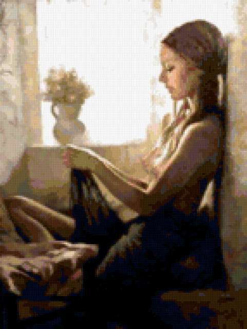 Ориентировочно так, схема вышивки «223», созданная автором zita, будет выглядеть при отшиве на канве. Размер данной вышивки равен 143x190 крестов, при этом используется 56 цветов. Ключевые слова, по которым можно найти эту схему: дама, девушка, картина. Также, вы можете взглянуть на оригинальную картинку, соответствующую данной схеме вышивки.