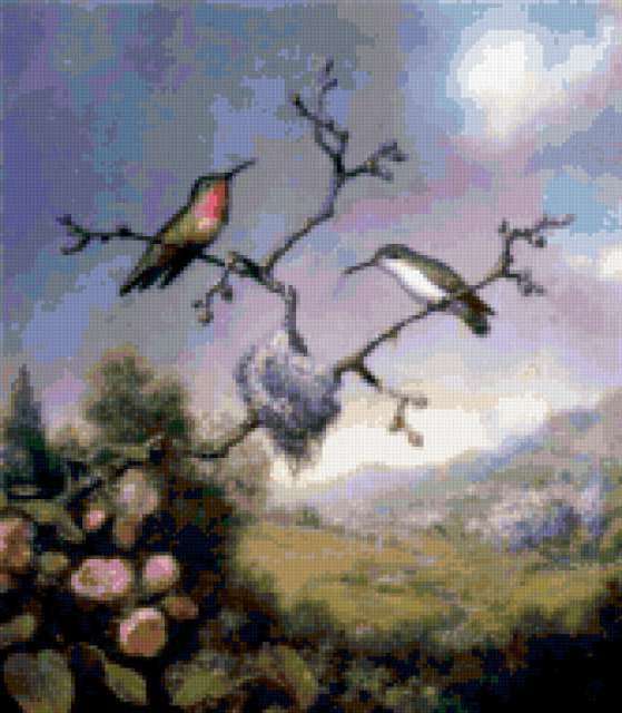 Ориентировочно так, схема вышивки «228», созданная автором Valkiriya, будет выглядеть при отшиве на канве. Размер данной вышивки равен 166x190 крестов, при этом используется 80 цветов. Ключевые слова, по которым можно найти эту схему: птицы, живопись, пейзаж, искусство. Также, вы можете взглянуть на оригинальную картинку, соответствующую данной схеме вышивки.