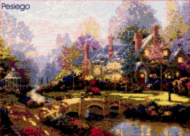 Ориентировочно так, схема вышивки «29», созданная автором olgabahk, будет выглядеть при отшиве на канве. Размер данной вышивки равен 190x136 крестов, при этом используется 79 цветов. Ключевые слова, по которым можно найти эту схему: дом, цветы, природа, река. Также, вы можете взглянуть на оригинальную картинку, соответствующую данной схеме вышивки.